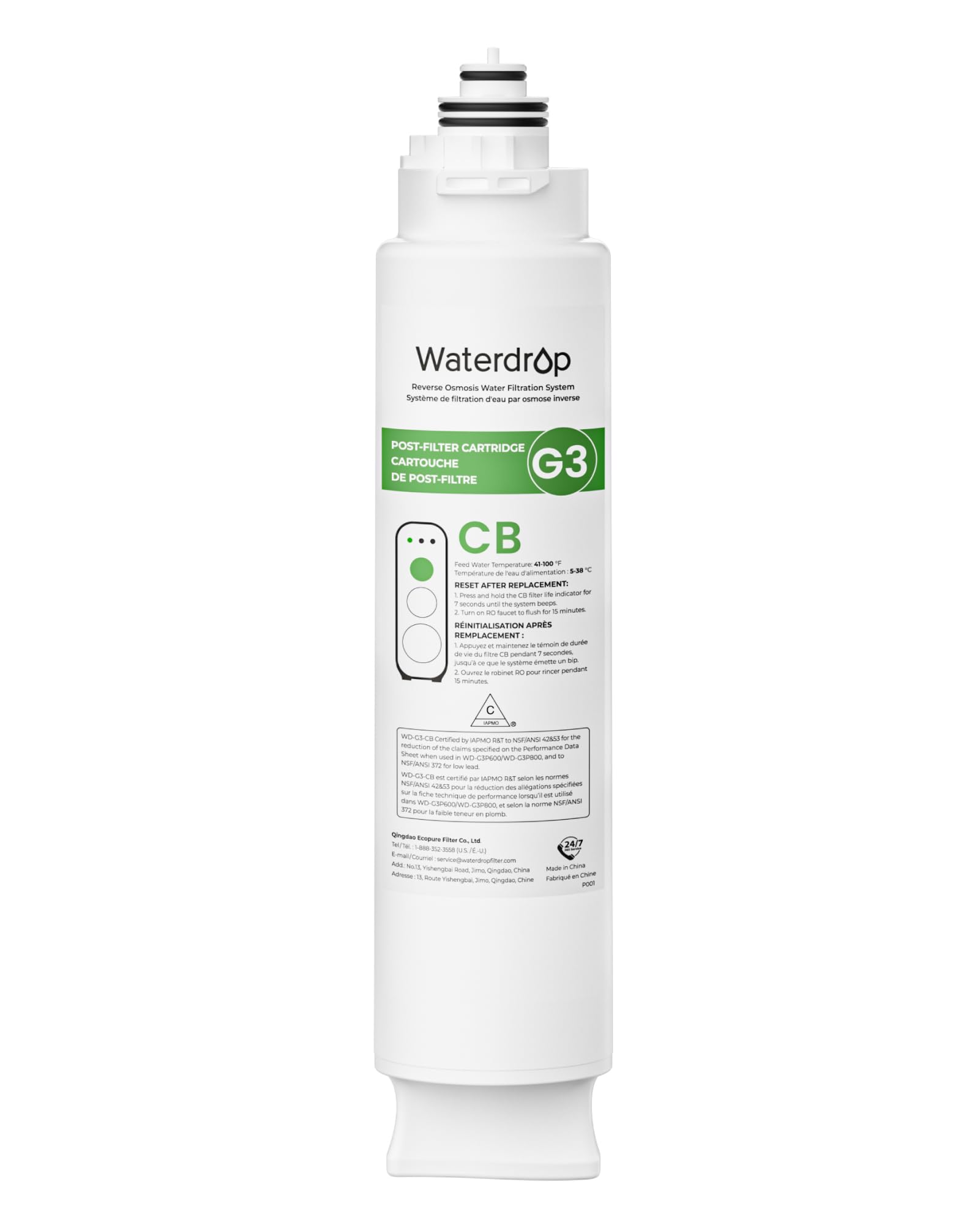 The Waterdrop WD-G3-N3CB is a high-performance replacement filter for the WD-G3-W Reverse Osmosis system, featuring a premium coconut shell-activated carbon block with smaller pores for superior chlorine and odor removal. It supports a maximum flow rate of 400 liters per day and lasts a full year, ensuring consistent delivery of clean, great-tasting water. Installation is tool-free and takes just three seconds, making maintenance effortless for busy professionals.