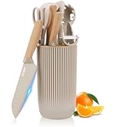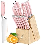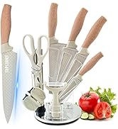 This 9-piece kitchen knife set features high-carbon German stainless steel blades with a V-shaped edge for superior sharpness and durability. Ergonomically designed full tang handles provide balance and comfort, while the included 360° rotating pink knife block offers a stylish, space-saving storage solution. Complete with a sharpener, scissors, and peeler, this set combines functionality with a fashionable pink finish, making it an ideal gift and a must-have for modern kitchens.