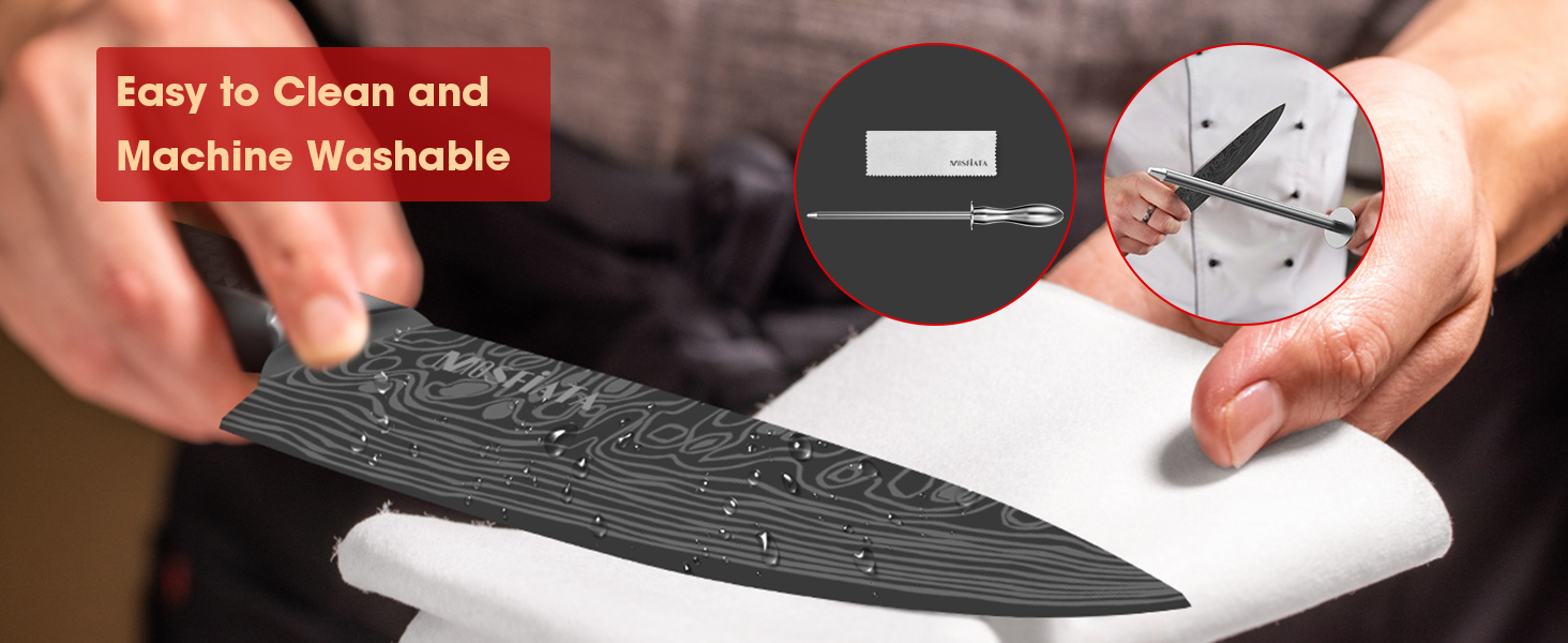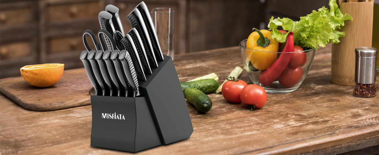 The MOSFiATA Kitchen Knife Set includes 17 essential pieces crafted from high carbon Japanese stainless steel, featuring a stylish and durable knife block. With a Rockwell hardness of 56+, these knives are designed for professional performance and are dishwasher safe, making them a perfect addition to any kitchen.