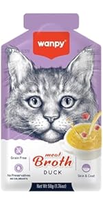 Wanpy Meat Broth Duck for Cats is a 50g grain-free liquid cat food made from natural duck broth, free from preservatives and artificial colorants. Designed to support digestive health and enhance skin and coat vitality, it suits cats of all breeds and life stages, delivering a clean, nutrient-rich meal that your feline will love.