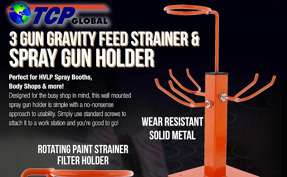 TCP GlobalGravity Feed Paint Triple Spray Gun Holder Stand with Strainer Holder, Holds 3 HVLP Guns, Bench Mount