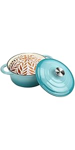 - 🍝Self-circulating Lid:The enameled cast iron dutch oven cover is thick and well sealed, which makes it difficult to lose water. The "self circulating water drop" design of the pot cover can enhance the water locking function and keep the original flavor.