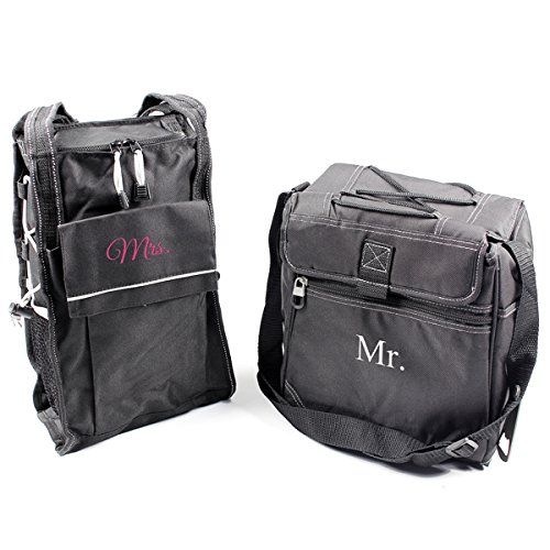 Featuring all the necessary parts for easy, organized travel, the fully insulated Mr. & Mrs. Cooler Set makes an ideal gift for all. Folds flat for storage. Dimensions: Mr. Cooler: 8.25 in. L x 9.5 in. H x 5.5 in. W. Holds up to six (6) bottles or twelve (12) cans / Mrs. Cooler: 14 in. H x 8.5 in. W x 5.5 in. D. Holds up to two (2) bottles of wine. Features: Heat sealed insulation, Velcro and zippered closures, front zippered pocket, with a side water bottle pouch, as well as adjustable shoulder strap with metal bottle opener on his and stretchy pull cord adjuster on hers