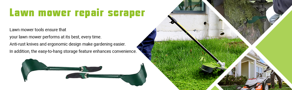 This mower deck scraper features a rust-resistant metal and rubber handle with an ergonomic long design, enabling efficient removal of grass clippings and debris from hard-to-reach mower deck areas. Its durable construction and easy storage option make it an essential tool for maintaining lawnmower performance and extending equipment lifespan.