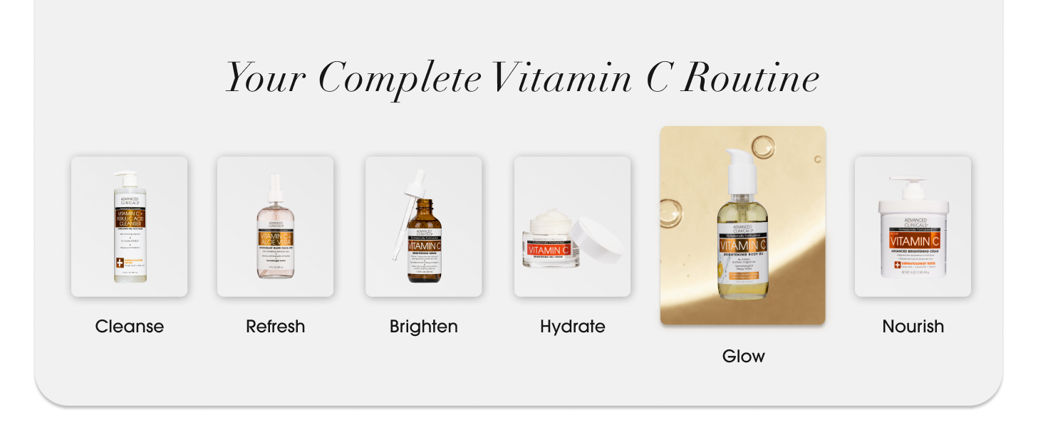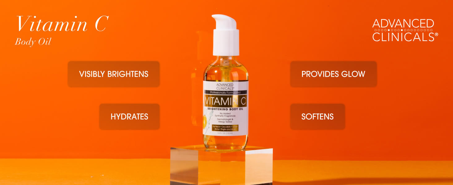 Advanced Clinicals Vitamin C Body Oil is a dermatologist-tested, science-driven moisturizer infused with Vitamin C, Turmeric Extract, Rosehip Oil, and Vitamin E. Designed to hydrate, brighten, and smooth dry or uneven skin, this luxurious 3.8 fl oz oil visibly improves dark spots, stretch marks, and dullness, delivering a radiant, supple glow with daily use.